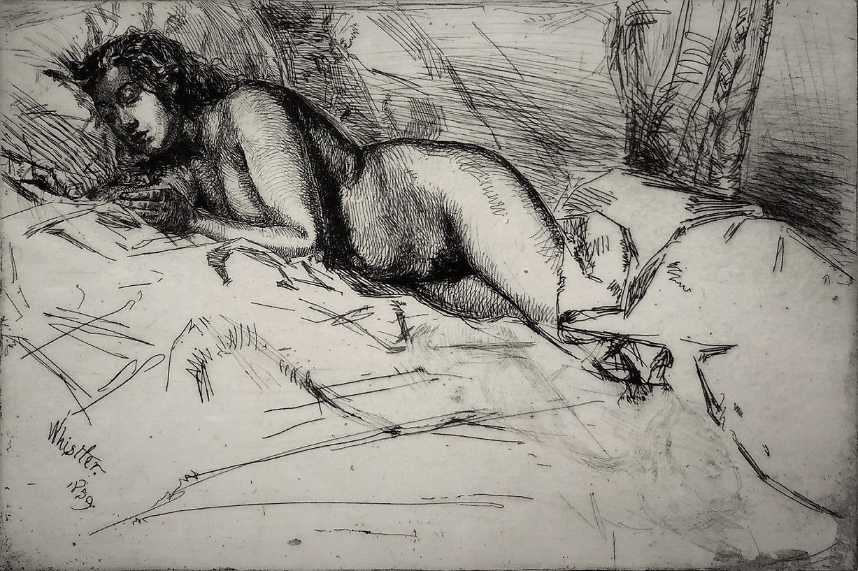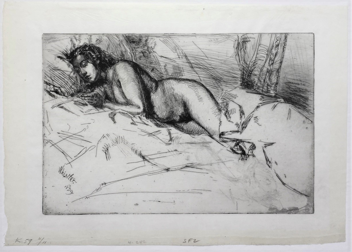 Venus. 1859. Etching and drypoint. Kennedy 59.ii; Glasgow 60.ii. 6 x 9 (sheet 8 x 11 3/16). Glasgow records 27 known impressions. There was no published edition. Signed and dated in the plate. $12,500.