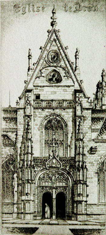 Église de Notre Dame, Bourg-En-Bresses. 1927. Etching. Fletcher 187. 8 3/4 x 4 (sheet 11 1/2 x 7). Edition 100. French Church Series #11. Illustrated: Dorothy Noyes Arms, Churches of France, p. 122. A fine impression printed on antique blue-green laid paper. Signed and dated in pencil. $275.